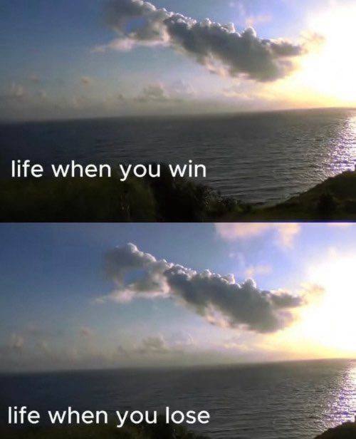 На изображении показано два одинаковых пейзажа с видом на море и небо на закате или рассвете. В верхней части картинки надпись гласит: "life when you win" (жизнь, когда ты выигрываешь), а в нижней части, на точно таком же пейзаже, написано: "life when you lose" (жизнь, когда ты проигрываешь). Мем демонстрирует, что независимо от побед или поражений, жизнь, по сути, остается неизменной, и человек сам придает ей смысл или окраску.
