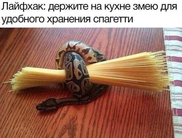 На изображении показана змея, обернувшаяся вокруг пачки спагетти, лежащих на деревянном столе. Голова змеи смотрит влево, а тело скручено так, что оно крепко держит длинные макароны. Рядом со спагетти лежит красно-белая полосатая ткань. Мем называется «Лайфхак: держите на кухне змею для удобного хранения спагетти».