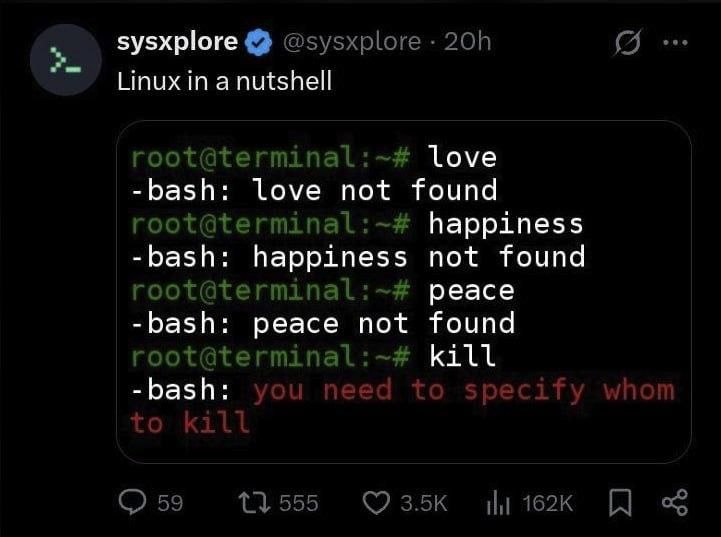 Linux in a nutshell. root@terminal:~# love. -bash: love not found. root@terminal:~# happiness. -bash: happiness not found. root@terminal:~# peace. -bash: peace not found. root@terminal:~# kill. -bash: you need to specify whom to kill.