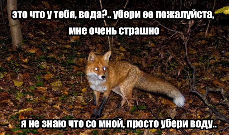 На изображении представлен рыжий лис, стоящий посреди леса, усыпанного осенними листьями и сухими ветками. На фоне видны стволы деревьев и кустарники. У лиса ярко светятся глаза, придавая ему немного мистический вид. Надпись на меме, словно произносимая лисом, гласит: "Это что у тебя, вода?.. Убери ее пожалуйста, мне очень страшно. Я не знаю что со мной, просто убери воду...". Таким образом, лис как будто боится воды, что придает мему комический или абсурдный оттенок. Судя по всему, он очень напуган и просит убрать таинственную воду, которая ему не нравится.