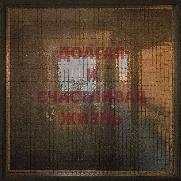 На изображении показана старая дверь с рифленым стеклом, через которое виден размытый фон. На стекле красной краской написана фраза «Долгая и счастливая жизнь». Буквы выглядят немного потертыми и нечеткими, что придает изображению винтажный или ностальгический вид. Общий тон фотографии темный и приглушенный, с оттенками коричневого и серого, создавая меланхоличную атмосферу. Сетка на стекле добавляет текстуру и глубину изображению, делая надпись еще более загадочной и трудноразличимой.