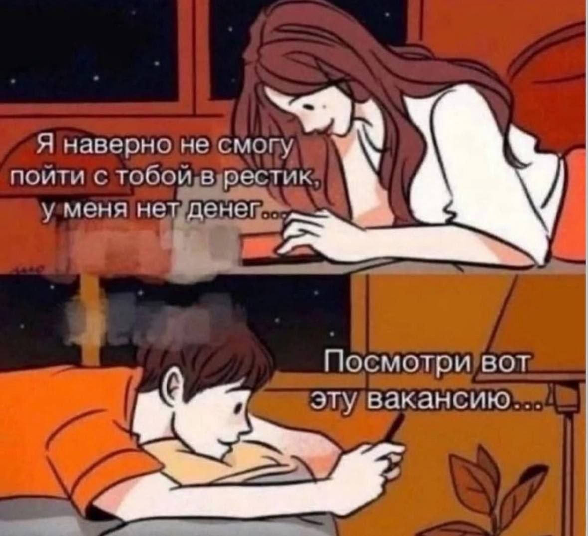 Мем состоит из двух панелей, нарисованных в стиле аниме. На верхней панели изображена девушка с длинными каштановыми волосами, лежащая и смотрящая в свой телефон. Рядом с ней текст: «Я наверное не смогу пойти с тобой в рестик, у меня нет денег…» (I probably can't go to the restaurant with you, I don't have any money...). На нижней панели изображен парень с короткими темными волосами, также лежащий и смотрящий в свой телефон. Рядом с ним текст: «Посмотри вот эту вакансию…» (Look at this job opening...). Мем иронично обыгрывает ситуации, когда человек предлагает решить финансовые трудности другого, предлагая ему работу вместо того, чтобы просто оплатить что-либо.