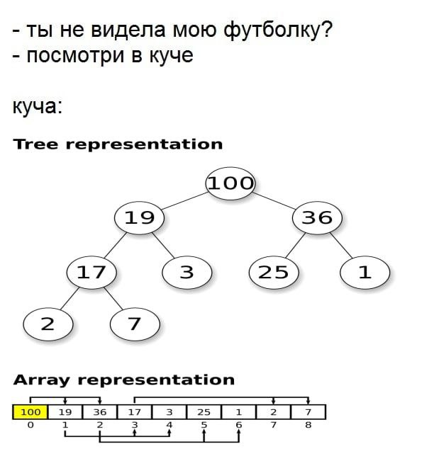 На картинке изображен диалог: «Ты не видела мою футболку? – Посмотри в куче». Ниже показана та самая «куча» в представлении дерева (Tree representation) и массива (Array representation) – это одна из структур данных в информатике. Сама «куча» выглядит как обычная диаграмма с цифрами, где 100 находится в корне дерева. Это забавное сопоставление бытовой ситуации и компьютерного термина. Мем обыгрывает фразу «посмотреть в куче» в прямом и переносном смысле. Он будет понятен тем, кто знаком с программированием и структурами данных, а также оценят игру слов.