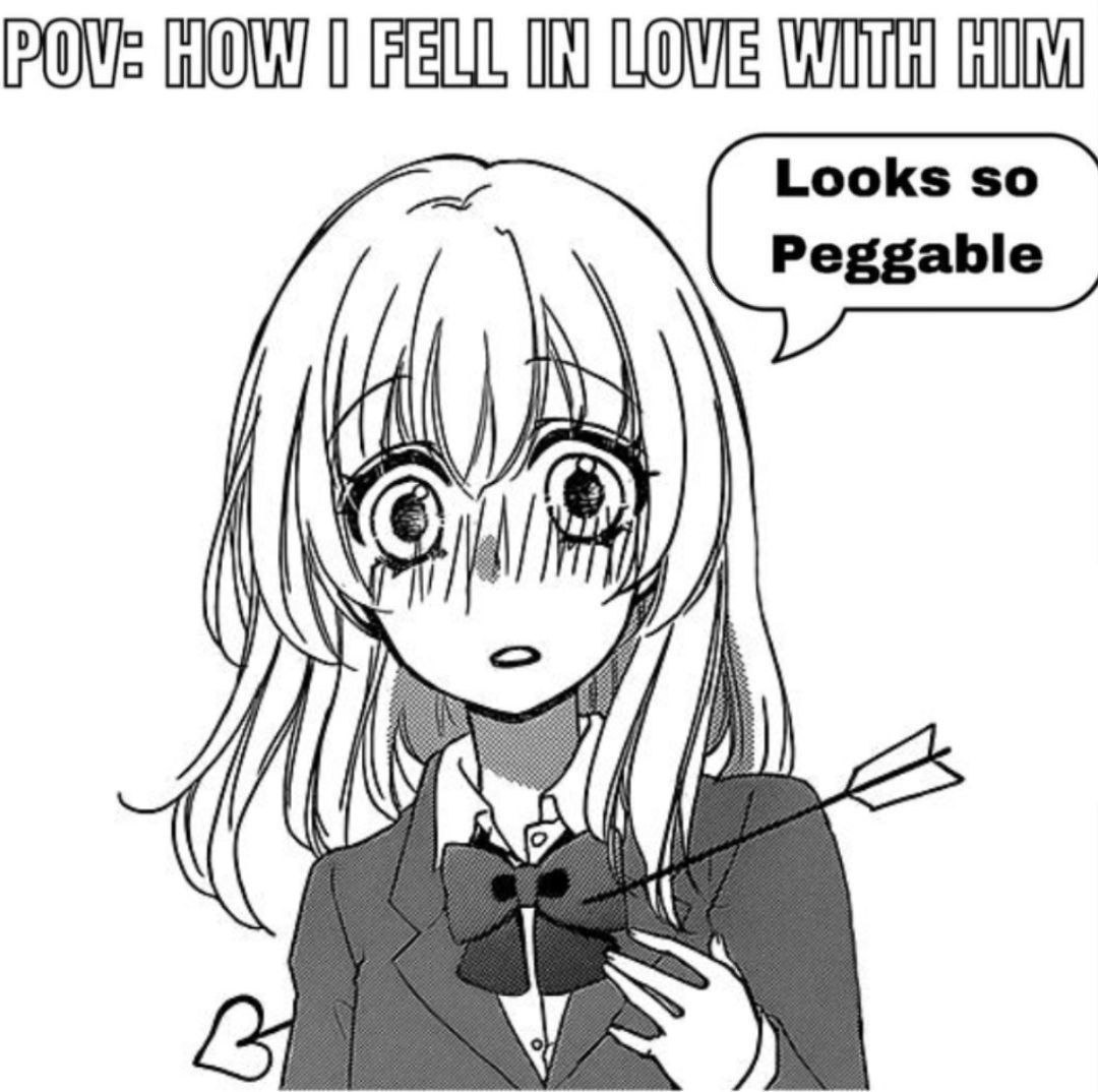 На чёрно-белом изображении в стиле аниме показана девушка, пронзенная стрелой Купидона в область сердца. У неё широко открыты глаза и румянец на щеках, что указывает на сильное смущение или удивление. Надпись сверху "POV: How i fell in love with him" (POV: Как я в него влюбилась) и в "облачке" рядом с девушкой "Looks so peggable" (Выглядит так, будто его можно пеггать) создают комический эффект, намекая на необычный характер её влюблённости. Мем обыгрывает тему неожиданной или нетрадиционной любви, где объект влюбленности вызывает у девушки желание доминировать. Это популярный интернет-мем для обозначения ситуаций, когда кто-то испытывает к другому человеку влечение, сочетающееся с желанием проявить властность или активную роль в отношениях.