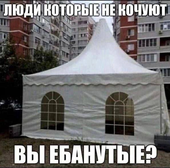 На изображении показан белый шатер с двумя декоративными окнами, установленный на зеленой траве во дворе жилых домов. Шатер выглядит как временное сооружение, возможно, предназначенное для мероприятий на свежем воздухе или как пункт выдачи чего-либо. Надписи на меме, выполненные крупным белым шрифтом, гласят: "Люди, которые не кочуют. Вы ебанутые?". Эта фраза иронично обыгрывает идею о том, что люди, которые не ведут кочевой образ жизни, возможно, сумасшедшие, или что они просто странные. Это создает комический эффект за счет контраста между обычным городским пейзажем и текстом, который подразумевает критику стационарного образа жизни.