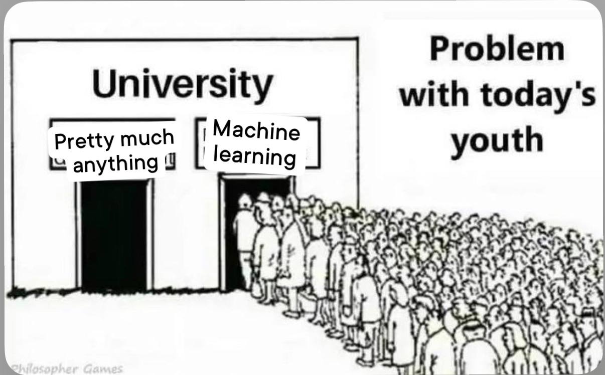 На изображении показан вход в университет, где есть две двери. Над одной дверью написано "Pretty much anything" (почти что угодно), а над другой – "Machine learning" (машинное обучение). У двери с надписью "Pretty much anything" никого нет, а к двери "Machine learning" выстроилась огромная очередь из молодых людей, которые хотят поступить туда. Справа на картинке текст "Problem with today's youth" (проблема с сегодняшней молодежью).