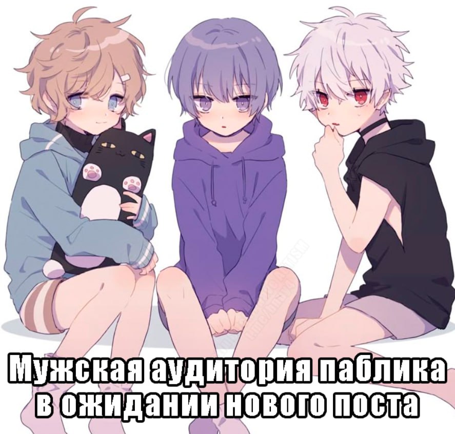 На изображении представлено три аниме-персонажа, похожих на молодых парней, в милой одежде, сидящих на белом фоне. Слева сидит персонаж со светло-коричневыми волосами и голубыми глазами в голубой толстовке, обнимающий плюшевую игрушку в виде черной кошки с розовыми лапками. В центре сидит персонаж с фиолетовыми волосами и фиолетовыми глазами в фиолетовой толстовке. Справа сидит персонаж с белыми волосами и красными глазами в черной толстовке без рукавов и черным чокером на шее, подпирающий подбородок пальцем. Все трое выглядят невинно и слегка наивно, с раскрасневшимися щеками. В нижней части изображения черным шрифтом на белом фоне написано: "Мужская аудитория паблика в ожидании нового поста", что означает, что это парни, подписчики паблика, ждут, когда выйдет новый пост.