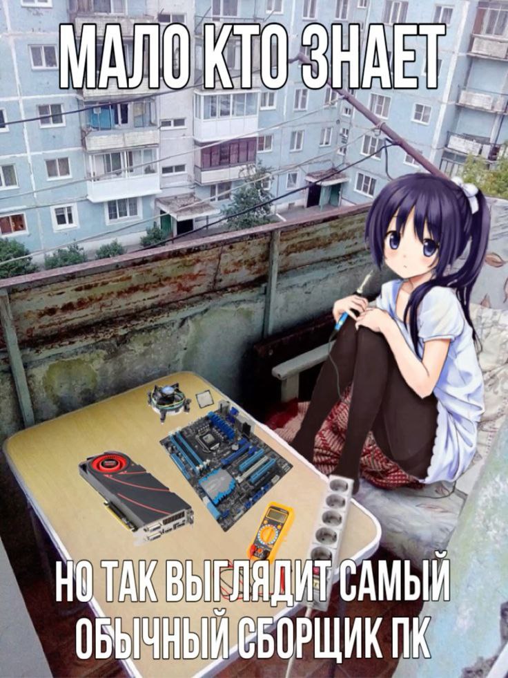 На изображении показан балкон старого жилого дома с обшарпанными стенами, на котором стоит маленький стол. На столе разложены компьютерные комплектующие: материнская плата, видеокарта, кулер для процессора, процессор и мультиметр. Рядом со столом сидит девушка-аниме с синими волосами, собранными в два хвостика, в белой рубашке и черных колготках. Она держит в руке какой-то предмет, похожий на отвертку или инструмент для пайки. На заднем плане виден фасад другого жилого дома. Сверху и снизу на картинке наложен текст. "Мало кто знает, но так выглядит самый обычный сборщик ПК" - это юмористическое утверждение, подчеркивающее стереотип о том, что сборщики компьютеров могут быть очень разными и работать в необычных условиях, а не только в стерильных мастерских. Также это может быть отсылкой к образу "тянки" или "вайфу" (девушки-аниме), которая увлекается техникой.