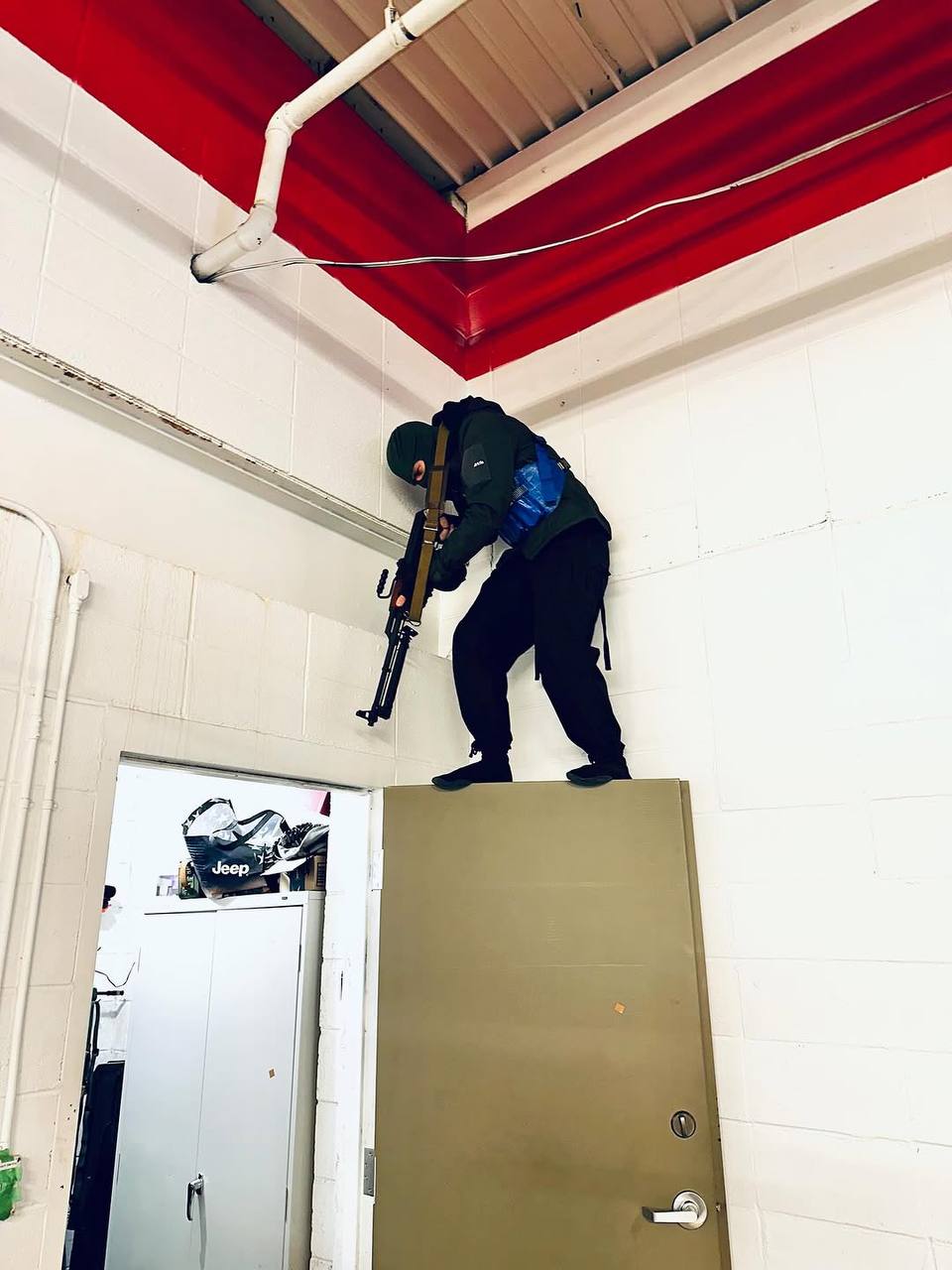 На изображении показан человек, одетый в черную куртку, черные штаны и черную балаклаву, стоящий на двери, которая, по-видимому, открыта и находится выше обычного уровня пола. Он держит в руках винтовку, направленную вниз, как будто целится в кого-то или что-то, находящееся за дверью. В левом нижнем углу виден проем двери, за которым виден шкаф и сумка с логотипом "Jeep". Стены вокруг человека белые, а потолок или верхняя часть стены имеют красную полосу, создавая контрастный фон. Эта сцена выглядит как боевая или тактическая операция, где человек занимает выгодную позицию для стрельбы сверху. Однако, учитывая нестандартное расположение двери и общую композицию, изображение может также быть частью шутки или использоваться для создания мема о неожиданных атаках или необычных местах для засады.