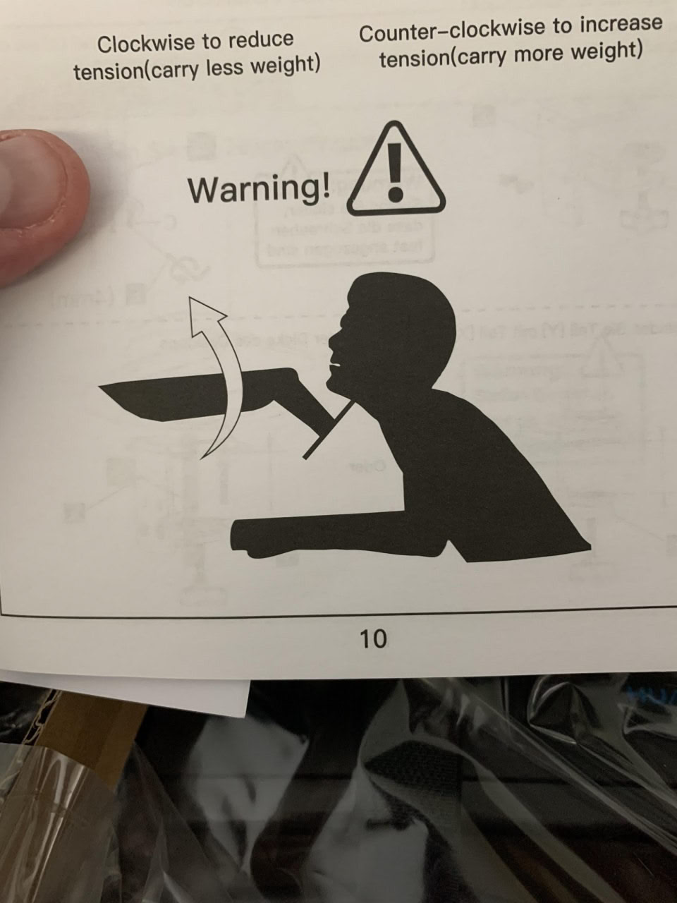 На изображении показан фрагмент инструкции или руководства по эксплуатации, вероятно, спортивного оборудования. В центре листа находится предупреждающий знак в виде треугольника с восклицательным знаком, а под ним — чёрный силуэт человека, лежащего на животе и упирающегося локтями в поверхность. К его руке прикреплен некий предмет, похожий на плоский рычаг или рукоять, направленный вверх, со стрелкой, указывающей на вращение по часовой стрелке. Над силуэтом находится надпись на английском языке «Warning!» (Внимание!). Выше даны две инструкции: «Clockwise to reduce tension (carry less weight)» (По часовой стрелке для уменьшения натяжения (несения меньшего веса)) и «Counter-clockwise to increase tension (carry more weight)» (Против часовой стрелки для увеличения натяжения (несения большего веса)). Сбоку виден палец человека, держащего страницу. Создаётся впечатление, что силуэт человека изображает нелепую позу, особенно с рычагом, торчащим изо рта, что может быть результатом неправильной интерпретации изображения в инструкции, делая его смешным или двусмысленным.
