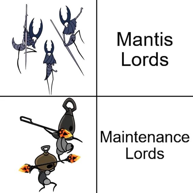 На двухпанельном меме изображены персонажи из игры Hollow Knight. В верхней левой части мема показаны три "Лорда богомолов" (Mantis Lords) – изящные насекомоподобные фигуры с рогами и острыми копьями, в своих характерных боевых позах. Они выглядят угрожающе и грациозно. В нижней левой части представлены две фигурки, стилизованные под "Лордов обслуживания" (Maintenance Lords): они выглядят как маленькие, коренастые персонажи с инструментами, напоминающими гаечные ключи или ломы, на концах которых горит пламя. Их внешний вид забавный, они как будто заняты починкой или обслуживанием, пародируя оригинальных Лордов богомолов. Справа от каждого изображения расположены соответствующие надписи: "Mantis Lords" (Лорды богомолов) сверху и "Maintenance Lords" (Лорды обслуживания) снизу.