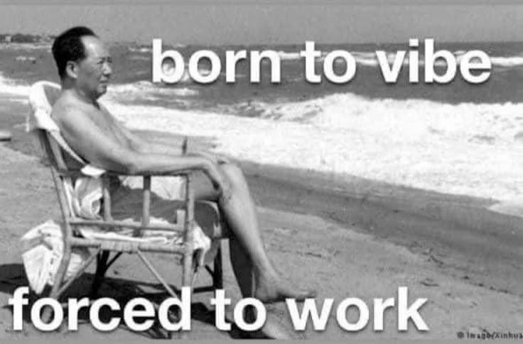 На чёрно-белом изображении представлен Мао Цзэдун, сидящий в шезлонге на пляже. Он одет лишь в плавки или находится топлес, расслабленно откинувшись на спинку стула и наслаждаясь видом на море. Волны разбиваются о берег на заднем плане, создавая умиротворяющую атмосферу. Надпись сверху гласит «born to vibe» (рожден, чтобы кайфовать), а снизу — «forced to work» (вынужден работать), что создает контраст между желанием отдыха и необходимостью трудиться, несмотря на статус и положение человека.