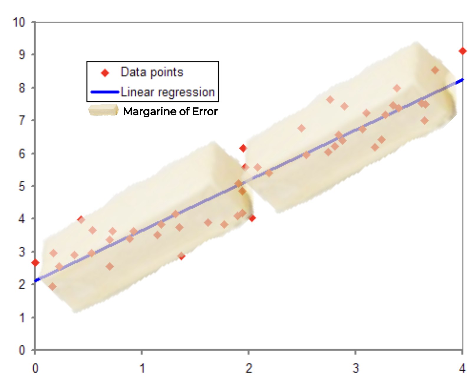 На изображении показан график с точками данных (красные ромбы) и линией линейной регрессии (синяя линия). Однако вместо стандартной полосы ошибок (confidence interval) или стандартного отклонения, вокруг линии регрессии изображены два продолговатых кусочка маргарина, которые обозначены как "Margarin of Error" (Маргарин Ошибки). Это намеренная шутка, обыгрывающая термины статистики, где "margin of error" (погрешность) заменена на "margarin of error". График демонстрирует линейную зависимость с некоторым разбросом данных, который забавно представлен с помощью кусков маргарина.