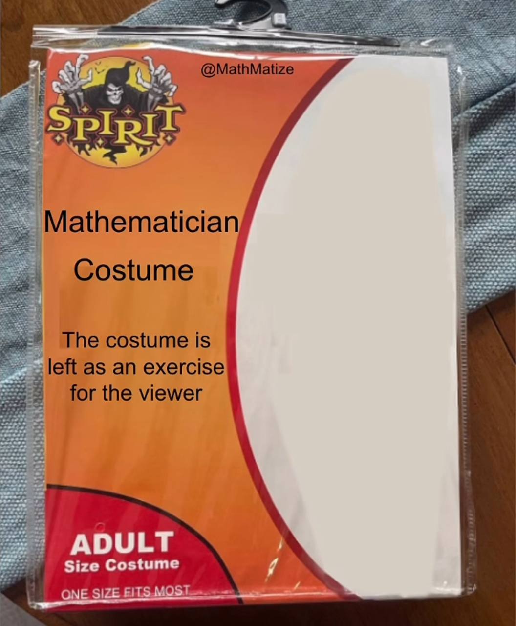 На изображении показана упаковка костюма для Хэллоуина под названием "Костюм математика" (Mathematician Costume). Большая часть упаковки пуста, а снизу мелким шрифтом написано: "Костюм оставлен в качестве упражнения для зрителя" (The costume is left as an exercise for the viewer). Этот мем играет на стереотипе о том, что математики любят решать задачи и что им даже костюм может быть представлен в виде головоломки, которую нужно "решить", то есть придумать самим. Надпись "ADULT Size Costume ONE SIZE FITS MOST" (Костюм для взрослых, один размер подходит большинству) добавляет иронии к этой концепции.