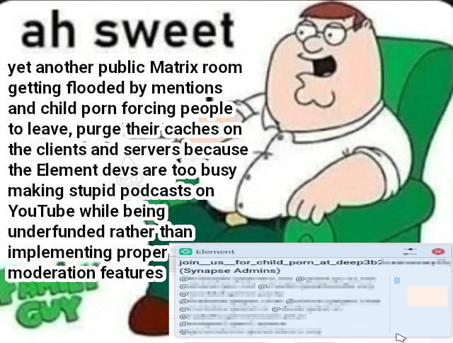 На меме изображен Питер Гриффин, персонаж из мультсериала «Гриффины», сидящий в кресле. На фоне виден скриншот мессенджера Element с комнатой, название которой намекает на непристойный контент. Текст на изображении высмеивает ситуацию в Matrix, где публичные комнаты заполняются упоминаниями и детской порнографией, из-за чего люди вынуждены уходить и очищать кэш на клиентах и серверах. При этом разработчики Element заняты созданием подкастов на YouTube, вместо того чтобы внедрять функции модерации.