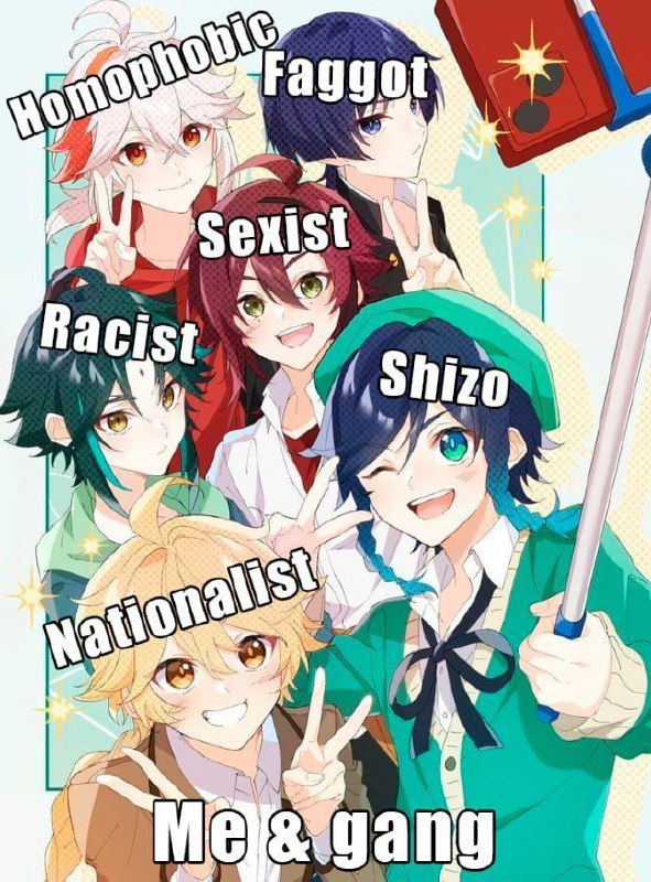 На изображении представлен коллаж из персонажей популярной игры Genshin Impact, которые делают селфи. Все они улыбаются и показывают знак мира V-образным жестом. Поверх каждого персонажа, кроме последнего, наложен текст с различными негативными ярлыками: Homophobic (гомофоб), Faggot (пидор), Sexist (сексист), Racist (расист), Shizo (шизик), Nationalist (националист). Снизу под последним персонажем наложена надпись «Me & gang» (Я и банда), что подчеркивает ироничный или сатирический контекст. Мем высмеивает или пародирует ситуацию, когда группа людей, которых воспринимают как "проблемных" или "токсичных", собирается вместе.