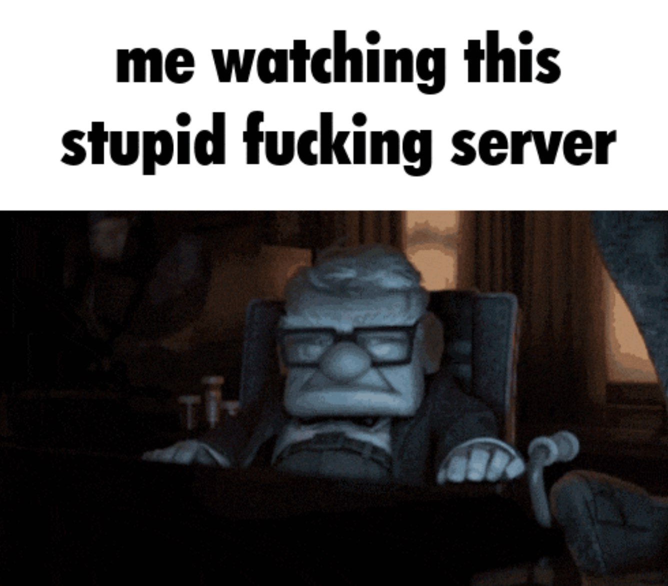 На изображении представлен кадр из мультфильма «Вверх», где Карл Фредриксен сидит в кресле. Он выглядит очень недовольным и понурым, его лицо выражает глубокую фрустрацию или разочарование. Над ним расположен текст: «me watching this stupid fucking server» (я смотрю на этот тупой, блять, сервер). Мем передает ощущение безысходности и раздражения, когда человек вынужден наблюдать за плохо работающим или неадекватным сервером, что вызывает у него крайнее недовольство и даже злость. Он идеально подходит для выражения чувств, когда пользователь испытывает проблемы с сетевыми сервисами или играми.