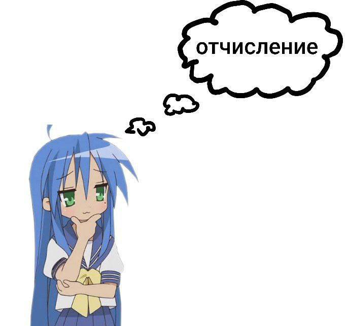 На картинке изображена девушка из аниме с синими волосами и в школьной форме, которая стоит, подперев подбородок рукой, и выглядит задумчивой или обеспокоенной. Над ее головой в облачке мыслей нарисована надпись «отчисление». Девушка, вероятно, студентка, и облако мыслей показывает, что она боится быть отчисленной из учебного заведения. Эта картинка часто используется для выражения тревоги или опасений по поводу возможного исключения из университета или колледжа, особенно во время сессии или сложных учебных периодов. Мем передает универсальное чувство страха перед неудачей в учебе.