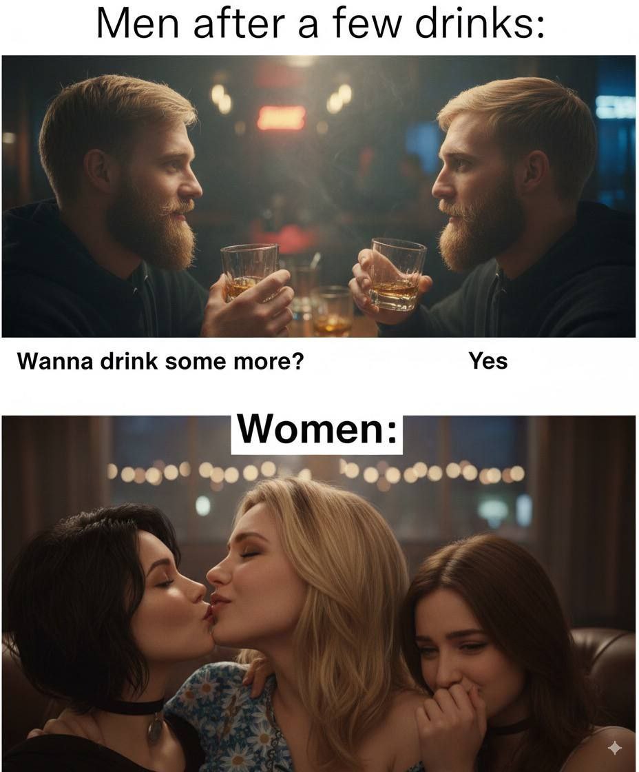 На верхней части изображения показаны два мужчины с бородами, сидящие в баре с бокалами виски. Они смотрят друг на друга, и кажется, что между ними происходит некий диалог, как будто один спрашивает: "Wanna drink some more?" ("Хочешь выпить еще?"), а другой отвечает: "Yes" ("Да"). Нижняя часть изображения демонстрирует трех женщин в более интимной обстановке. Две из них целуются, а третья смотрит на них с улыбкой, прикрывая рот рукой. Она выглядит смущенной или хихикающей, что создает контраст с прямолинейным взаимодействием мужчин.