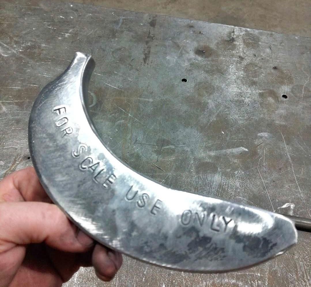 На изображении видна рука, держащая металлический предмет, изогнутый в форме банана. Предмет выглядит тяжелым и отполированным, с выгравированным текстом на его поверхности. Текст "FOR SCALE USE ONLY" (Только для использования в качестве масштаба) явно виден. Рука держит его над серой, потертой металлической поверхностью, возможно, верстаком, что придает изображению индустриальный или рабочий вид. Этот металлический банан, предназначенный "только для масштаба", является забавным отсылкой к популярной интернет-шутке, где банан используется для демонстрации размеров других объектов. Металлическая версия банана подчеркивает абсурдность и юмор ситуации, создавая визуальный каламбур.