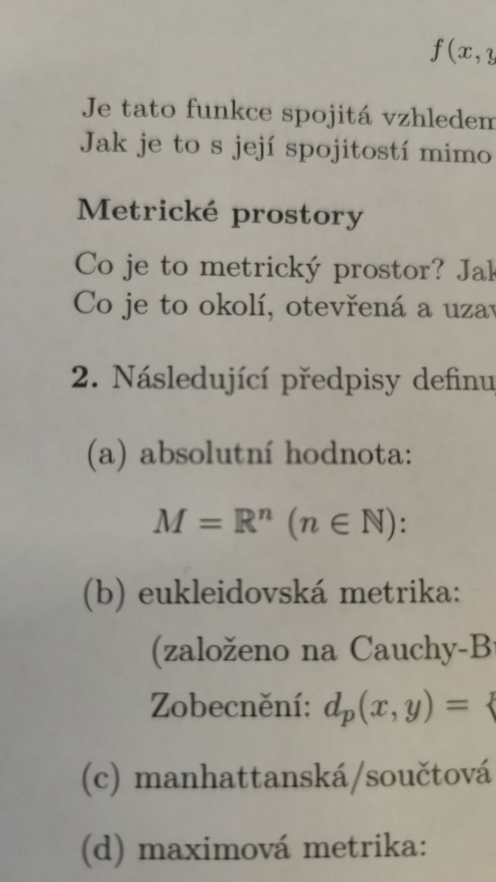 Je tato funkce spojitá vzhledem. Jak je to s její spojitostí mimo. Metrické prostory. Co je to metrický prostor? Jak. Co je to okolí, otevřená a uzav. 2. Následující předpisy definuj. (a) absolutní hodnota: M = Rn (n N): (b) eukleidovská metrika: (založeno na Cauchy-Bu. Zobecnění: dp(x, y) = (. (c) manhattanská/součtová. (d) maximová metrika:
