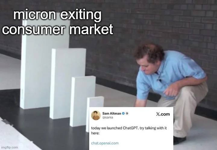 Мем изображает классический эффект домино, где падение одной "кости" вызывает цепную реакцию. На картинке сверху надпись "micron exiting consumer market" (Micron уходит с потребительского рынка). Справа видно человека, который готовится толкнуть первую "кость" домино. Перед ним на полу стоят несколько белых прямоугольных блоков, имитирующих домино, готовые упасть. В нижнем правом углу расположен скриншот поста Сэма Альтмана (Sam Altman) в X.com (Twitter) с текстом "today we launched ChatGPT, try talking with it here: chat.openai.com" (сегодня мы запустили ChatGPT, попробуйте поговорить с ним здесь). Этот мем иронично показывает, как запуск ChatGPT Сэмом Альтманом может стать той самой первой "костью" домино, которая приведет к серьезным изменениям или даже уходу Micron с потребительского рынка.