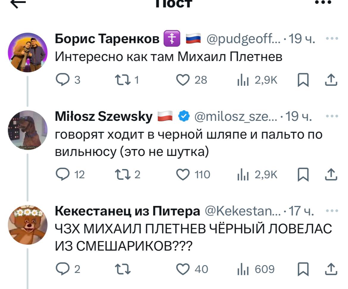 На изображении представлена переписка из Твиттера, состоящая из трех постов. Первый пользователь, Борис Таренков, интересуется, как дела у Михаила Плетнева. Второй пользователь, Miłosz Szewsky, отвечает, что Михаил Плетнев ходит в черной шляпе и пальто по Вильнюсу, уточняя, что это не шутка. Третий пользователь, Кекестанец из Питера, в шоке от этой информации и спрашивает: "ЧЗХ МИХАИЛ ПЛЕТНЕВ ЧЁРНЫЙ ЛОВЕЛАС ИЗ СМЕШАРИКОВ???". Этот мем обыгрывает неожиданное сравнение известного дирижера и пианиста Михаила Плетнева с вымышленным персонажем из мультсериала "Смешарики", который ассоциируется с "черным ловеласом", что создает комический эффект.