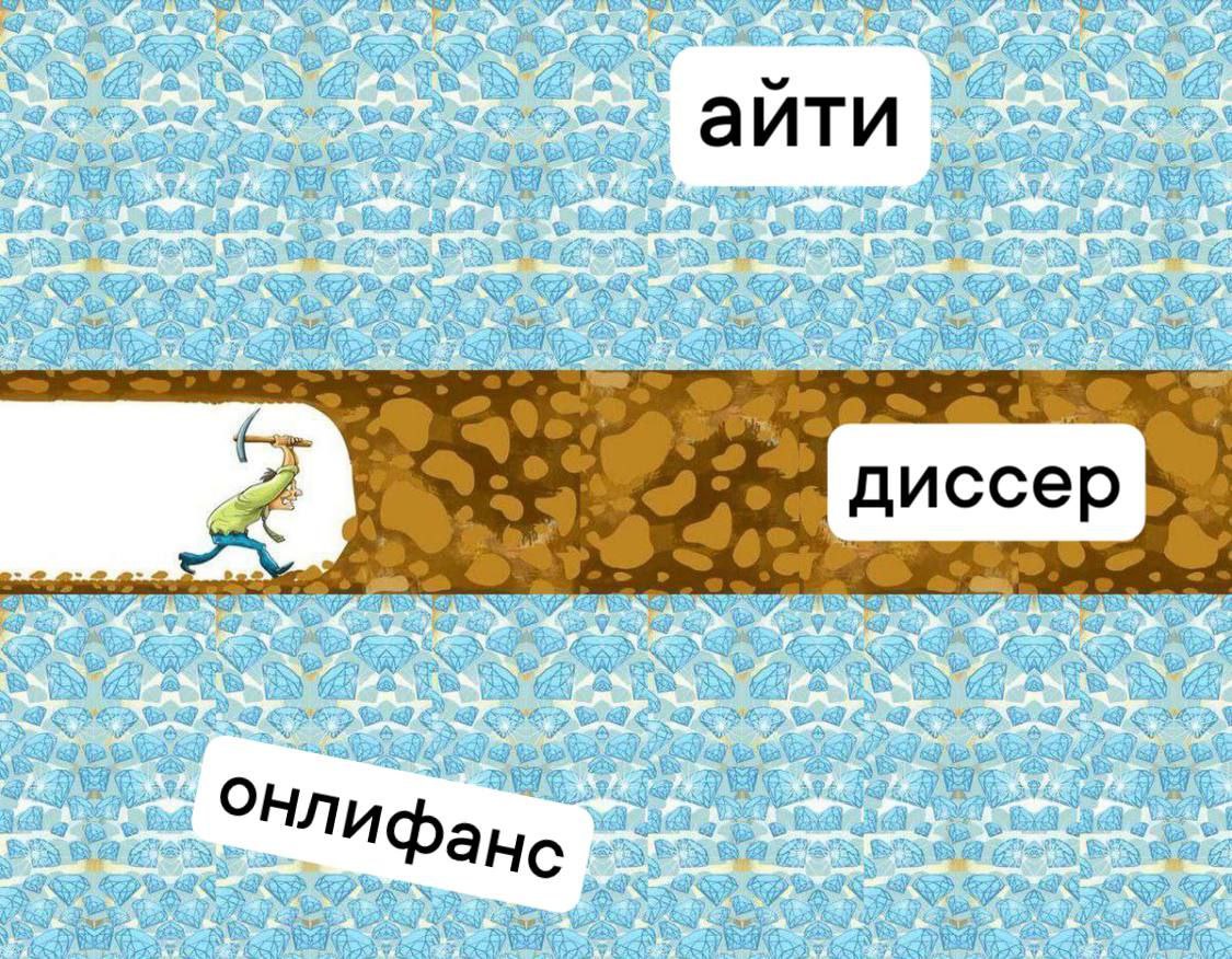 На изображении показан мультипликационный шахтер, усердно копающий киркой туннель в земле. Земля вокруг него напоминает грязь, но над и под его туннелем видны слои блестящих голубых алмазов. В меме присутствуют три надписи, представляющие разные сферы деятельности или заработка: «айти» (IT), «диссер» (диссертация) и «онлифанс» (OnlyFans). Этот мем высмеивает современный выбор между традиционными и новыми способами заработка, а также подчеркивает, что некоторые из них могут быть «золотоносной жилой» (алмазы на фоне), тогда как другие требуют тяжелого и изнурительного труда, не принося такого же быстрого и легкого результата.