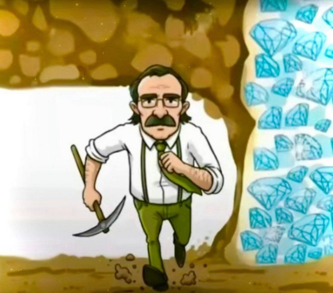 На изображении представлен мультяшный шахтер или старатель с усами и в очках, одетый в белую рубашку, зеленый галстук и зеленые штаны с подтяжками. Он бежит, держа в руке кирку, и оставляет за собой следы пыли и земли. Шахтер направляется прочь от стены, изобилующей крупными сияющими алмазами, которые находятся совсем близко, буквально в паре шагов от него. Фон состоит из земляных и каменных пород, создавая ощущение пещеры или шахты, а сама сцена подразумевает, что он уходит от богатства, не заметив его или отказавшись от него слишком рано.