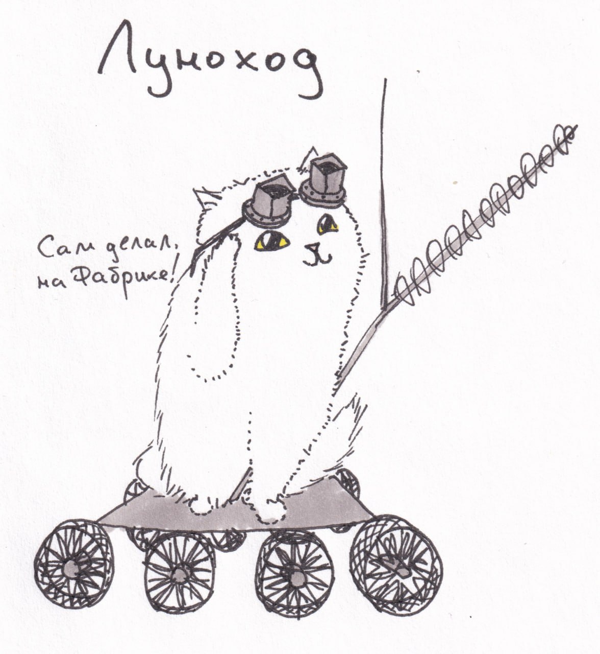 На изображении представлен рисунок забавного белого кота, стилизованного под луноход. Кот сидит на платформе с восемью колесами, у него на голове надеты странные очки, а сбоку торчит антенна-манипулятор. Рядом с котом видна надпись «Сам делал, на Фабрике!», которая подчеркивает его самостоятельность и оригинальность. Общий вид рисунка создает впечатление милого и немного наивного произведения, где пушистый "луноход" готов исследовать новые горизонты, и при этом он очень гордится тем, что сделал себя сам. Этот мем вызывает улыбку и поднимает настроение.