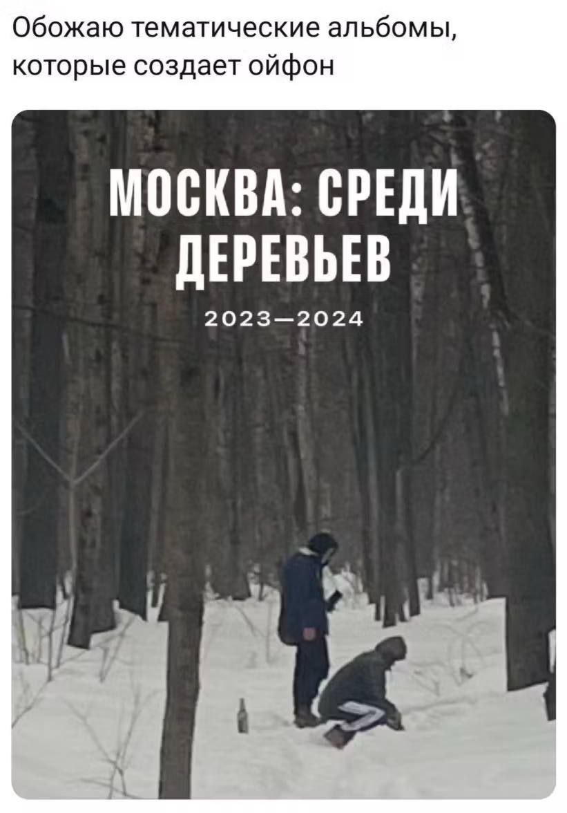 Мем изображает экран телефона с фотографией двух человек в зимнем лесу, покрытом снегом. Над фотографией подпись: "Обожаю тематические альбомы, которые создает айфон". На самой фотографии крупными белыми буквами текст: "Москва: среди деревьев 2023-2024". Один человек стоит, а другой сидит на корточках в снегу, рядом с ними виднеется бутылка. Смысл мема заключается в ироничном отношении к функции iPhone, которая автоматически создает тематические альбомы из фотографий, порой собирая их в абсурдные или забавные подборки, как в данном случае "Москва: среди деревьев", показывая обыденную сцену в парке или лесу.