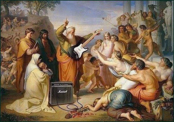 На картине «Поклонение золотому тельцу» Моисей спускается с горы, неся в руках электрогитару и усилитель Marshall, в то время как другие люди вокруг него поклоняются золотому тельцу. Он выглядит очень злым и с его лица можно понять, что он недоволен происходящим. Тем временем люди с правой стороны картины ликуют, поднимают руки, а некоторые даже лежат на земле, преклоняясь перед золотым тельцом, который нарисован на заднем плане картины. В центре картины изображены две женщины, одна из которых держит ребенка, а другая сидит на коленях, обхватив руками голову, и смотрит на Моисея. Люди с левой стороны картины находятся в тени, и среди них тоже есть дети.