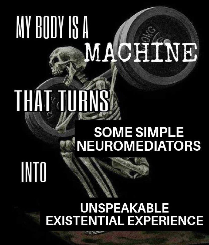 На меме изображен скелет, который поднимает штангу, а на черном фоне размещен текст, который раскрывает идею о том, что тело является механизмом. Надпись "My body is a machine that turns some simple neuromediators into unspeakable existential experience" переводится как "Мое тело – это машина, которая превращает простые нейромедиаторы в невыразимый экзистенциальный опыт". Этот мем подчеркивает, как химические процессы в мозге формируют наше глубокое и сложное внутреннее переживание. Изображение и текст расположены таким образом, чтобы создать мрачную, но философскую атмосферу, побуждающую задуматься о взаимосвязи между физиологией и сознанием. Он может использоваться для выражения мыслей о спорте, духовности или просто для юмора.