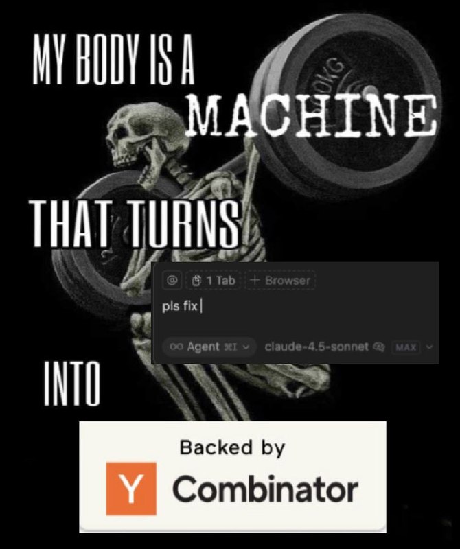 На изображении представлен мем, на котором скелет поднимает тяжелую штангу, символизируя напряженную работу. Над скелетом и вокруг него расположены надписи, которые в совокупности формируют фразу "MY BODY IS A MACHINE THAT TURNS". В центральной части мема, поверх скелета, находится окно ввода текста, где отображается "pls fix", а ниже указаны "Agent" и "claude-4.5-sonnet". В нижней части изображения, под скелетом, находится логотип "Y Combinator" с подписью "Backed by". Таким образом, мем передает идею о том, что тело (или усилия) превращает проблемы, обозначенные как "pls fix", в успешные проекты, поддерживаемые Y Combinator. Фраза "pls fix" переводится как "пожалуйста, исправь" и означает просьбу о доработке или исправлении чего-либо.