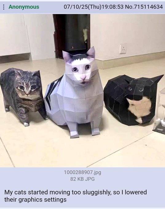 На изображении представлен скриншот с анонимного имиджборда, где пользователь поделился фотографией трёх бумажных кошек. Все три фигуры сделаны из бумаги и выглядят как низкополигональные модели животных из видеоигр. Слева находится полосатая кошка, выполненная в реалистичной текстуре, но с угловатыми формами. В центре — белая кошка с чёрными ушами и полосками, её мордочка имеет более мультяшный вид с большими круглыми глазами. Справа лежит чёрная кошка с белым пятном на груди, также выполненная в угловатом стиле. Под изображением находится подпись пользователя: "My cats started moving too sluggishly, so I lowered their graphics settings", что переводится как: "Мои кошки начали двигаться слишком медленно, поэтому я понизил их настройки графики".