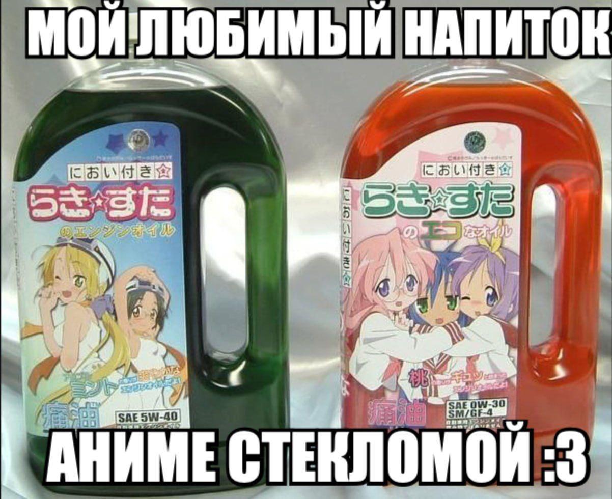 На изображении представлены две пластиковые бутылки моторного масла, оформленные в стиле аниме. На зеленой бутылке изображены две аниме-девушки в топах и головных уборах, а на красной — три аниме-девушки, обнимающиеся друг с другом. Текст на этикетках на японском языке, а также указаны характеристики масла, например, "SAE 5W-40" и "SAE 0W-30 SM/GF-4". В верхней части изображения крупными белыми буквами на черном фоне написано "Мой любимый напиток", а в нижней части — "Аниме стекломой :3". Это создает комический эффект, так как пользователь иронично называет техническую жидкость своим любимым напитком, обыгрывая популярность аниме и "стекломоя" (незамерзающей жидкости, которую иногда ассоциируют с алкоголем).