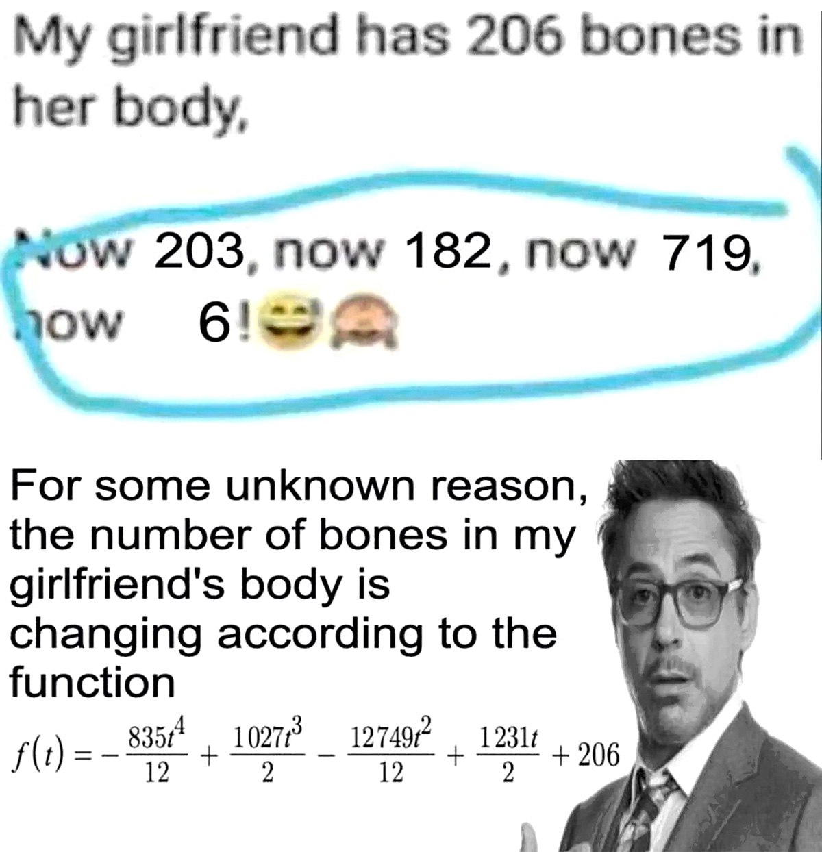 На меме изображен Роберт Дауни-младший в очках, который выглядит удивленным и показывает большим пальцем вверх. На изображении текст о том, что у девушки 206 костей в теле, а затем количество костей начинает меняться по какой-то функции, и в конце остается всего 6 костей. Это может быть связано с тем, что девушка, возможно, была съедена или расчленена, а в итоге осталась лишь часть тела с шестью костями. Функция, описывающая изменение количества костей, также видна на изображении. Мем, вероятно, является черным юмором или шуткой о ситуации, когда количество костей у человека может значительно уменьшиться, что указывает на ужасные последствия или трагическую развязку.
