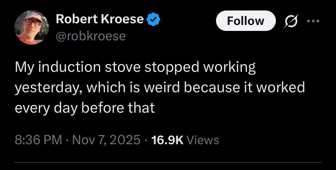 Мем представляет собой скриншот публикации Роберта Кроуза (@robkroese) в социальной сети X (ранее Twitter), сделанной 7 ноября 2025 года в 20:36 и набравшей 16,9 тысяч просмотров. На черном фоне белым текстом написано: "My induction stove stopped working yesterday, which is weird because it worked every day before that". В русском переводе это означает: "Моя индукционная плита перестала работать вчера, что странно, потому что до этого она работала каждый день". Публикация является юмористической игрой слов, поскольку "вчера" (yesterday) и "каждый день до этого" (every day before that) противоречат друг другу, создавая абсурдную ситуацию, которую автор преподносит как "странную". В левом верхнем углу виден небольшой круглый аватар пользователя: мужчина средних лет в очках и кепке, смотрящий в камеру с легкой улыбкой. Рядом с именем пользователя стоит синяя галочка, указывающая на верифицированный аккаунт. Справа расположены кнопки "Follow" (Подписаться), а также значки для отключения уведомлений и дополнительных опций.