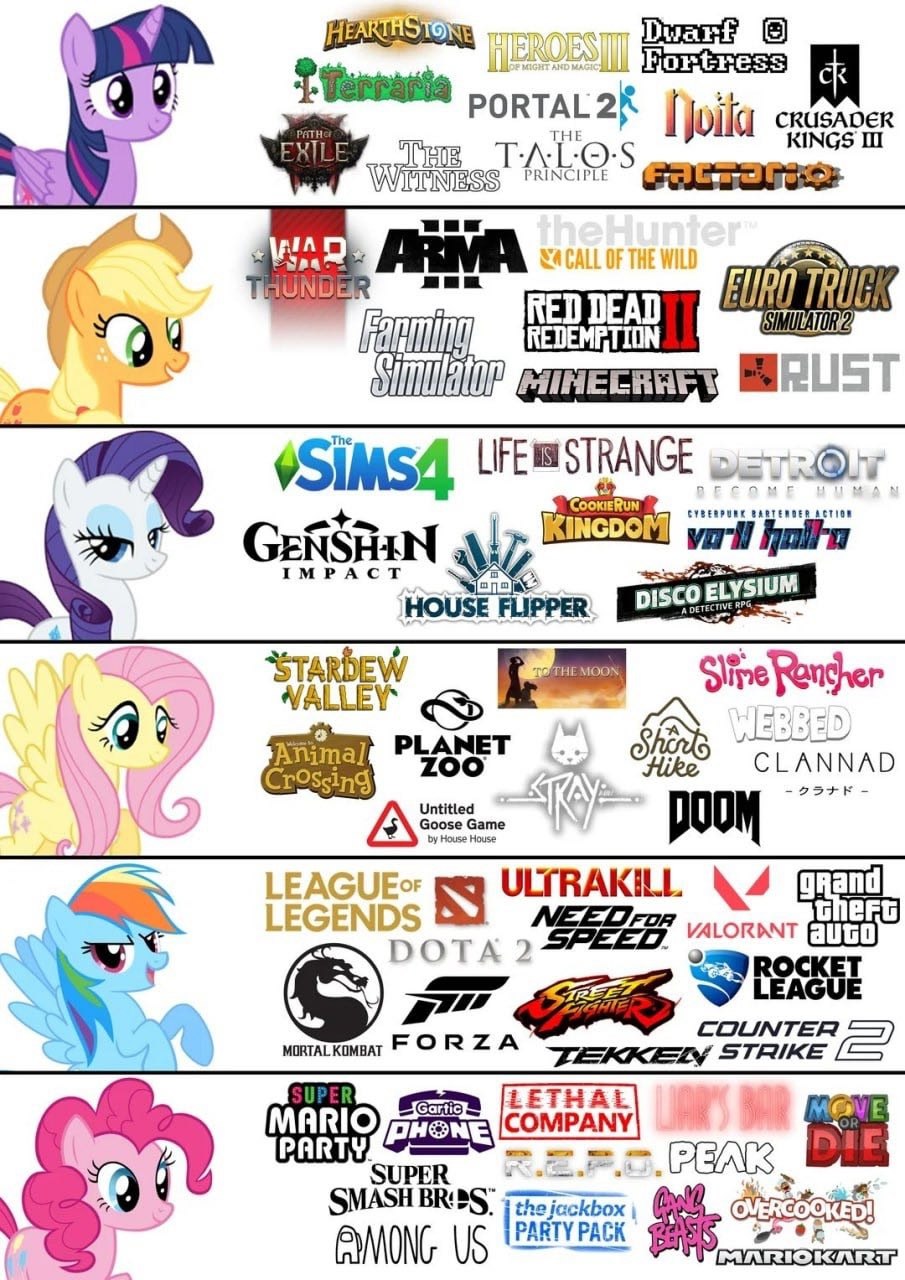 На изображении представлен коллаж с персонажами мультсериала "My Little Pony: Friendship Is Magic" и логотипами видеоигр, с которыми ассоциируется каждый пони. В "My Little Pony" шесть главных героинь, каждая из которых обладает уникальными чертами характера и интересами. Соответственно, каждая пони сопоставлена с играми, которые, по мнению автора мема, отражают её личность или предпочтения. Например, Сумеречная Искорка, умная и любознательная, ассоциируется со стратегиями и головоломками, такими как Hearthstone, Heroes III и Portal 2. Эпплджек, трудолюбивая и приземленная, представлена с играми, связанными с фермерством, строительством и выживанием, например, Farming Simulator, Minecraft, Rust и Red Dead Redemption 2. Рарити, утонченная и творческая, ассоциируется с симуляторами жизни и сюжетными играми, такими как The Sims 4, Genshin Impact и Life is Strange. Флаттершай, добрая и скромная, сопоставлена с уютными играми про животных и приключения, включая Stardew Valley, Animal Crossing, Planet Zoo и Stray. Рэйнбоу Дэш, смелая и быстрая, ассоциируется с соревновательными и динамичными играми, такими как League of Legends, Dota 2, Mortal Kombat, Valorant, Counter-Strike 2 и Rocket League. Пинки Пай, веселая и общительная, представлена с играми для вечеринок и кооперативными играми, такими как Super Mario Party, Among Us и Overcooked. Этот мем демонстрирует креативный подход к классификации игр через призму популярных персонажей, предлагая забавные и часто точные аналогии.