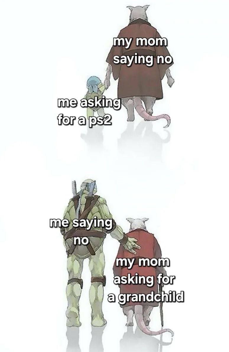 Мем изображает две похожие ситуации, но с противоположными ролями. В верхней части картинки мы видим, как взрослый крыс-Сплинтер, символизирующий "мою маму", ведет за руку маленького черепашонка-ниндзя, олицетворяющего "меня". Над Сплинтером написано "my mom saying no" (моя мама говорит нет), а над черепашонком "me asking for a ps2" (я прошу ps2). В нижней части мема ситуация меняется. Теперь взрослый черепашка-ниндзя (я) ведет за руку старого Сплинтера в плаще (моя мама). Над черепашонком написано "me saying no" (я говорю нет), а над Сплинтером "my mom asking for a grandchild" (моя мама просит внука). Этот мем наглядно показывает, как отношение к просьбам меняется с возрастом и сменой ролей в семье.