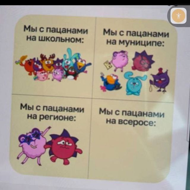 На изображении представлен мем с четырьмя панелями, показывающими уменьшающееся количество персонажей Смешариков по мере продвижения от школьного этапа к всероссийскому. На первой панели, озаглавленной "Мы с пацанами на школьном", изображено множество Смешариков, весело проводящих время. На второй панели, "Мы с пацанами на муниципале", их уже меньше, и они выглядят чуть более серьезными. На третьей панели, "Мы с пацанами на регионе", остались только два персонажа, один из которых выглядит опечаленным. Последняя панель, "Мы с пацанами на всеросе", полностью пуста, символизируя, что к этому этапу никого не осталось.