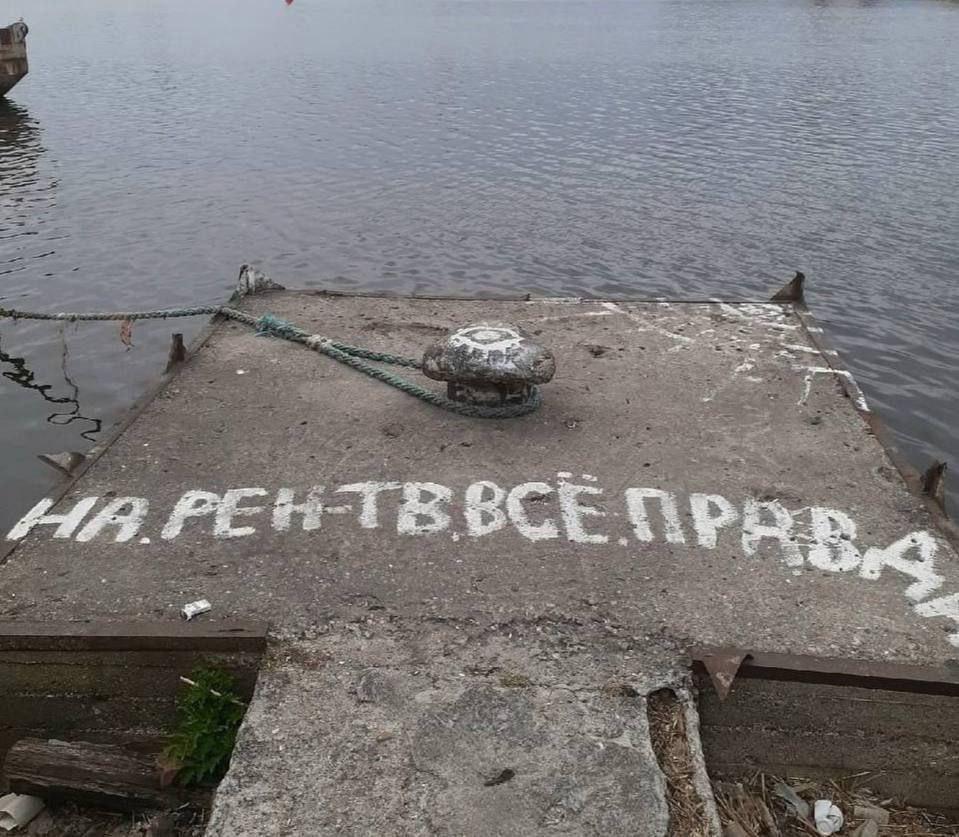 На изображении показан серый бетонный пирс, уходящий в темную воду. На пирсе белой краской крупными буквами написано "НА РЕН-ТВ ВСЁ ПРАВДА". На переднем плане виден швартовный кнехт с намотанной на него веревкой. Вокруг пирса вода спокойная, и на заднем плане виден край другого судна или конструкции. Эта надпись "На РЕН-ТВ всё правда" (перевод: "Everything on REN-TV is true") является шуточной отсылкой к российскому телеканалу РЕН-ТВ, который часто ассоциируется с трансляцией псевдонаучных и конспирологических теорий. Надпись на пирсе придает ей ироничный или сатирический оттенок, особенно учитывая неказистый фон.