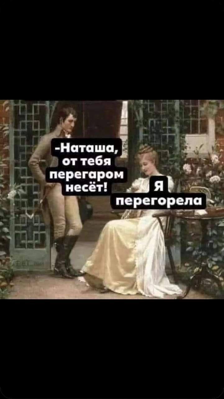 Мем создан на основе картины XIX века, предположительно изображающей сцену из повседневной жизни высшего общества. На изображении мы видим мужчину в историческом костюме, который стоит и обращается к сидящей даме. Дама одета в пышное светлое платье и сидит за небольшим столом, возможно, в саду или на террасе, окруженной зеленью и цветами. Надписи на меме добавляют юмористический контраст к винтажному сюжету. Мужчина говорит: «Наташа, от тебя перегаром несёт!» (Natasha, you reek of hangover!), на что женщина отвечает: «Я перегорела» (I've burnt out). Эта фраза может означать как сильную усталость или выгорание, так и более прямолинейный смысл, связанный с алкогольным опьянением, что делает мем актуальным для описания состояния после бурных событий или просто хронической усталости.