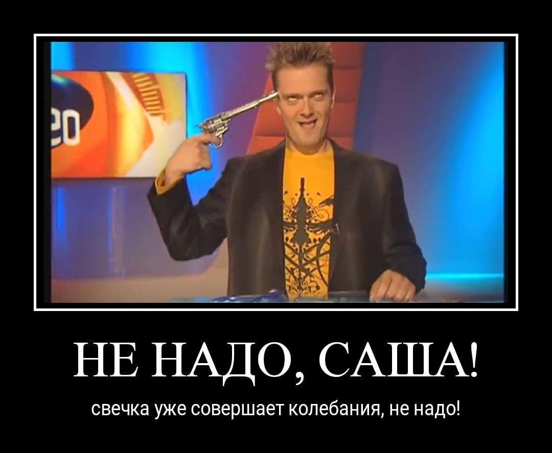 На изображении представлен кадр из телепередачи, где мужчина в жёлтой футболке с рисунком и тёмном пиджаке приставляет револьвер к своему виску. Он смотрит прямо в камеру с безумным или очень сосредоточенным выражением лица. На заднем плане виден экран с цифрами 20 и элементами графического оформления. В нижней части изображения, под кадром, присутствует надпись крупным шрифтом "НЕ НАДО, САША!", а ниже более мелким "свечка уже совершает колебания, не надо!". Эта фраза, вероятно, является отсылкой к какой-то известной ситуации или внутреннему мему, обозначающему критический или опасный момент.