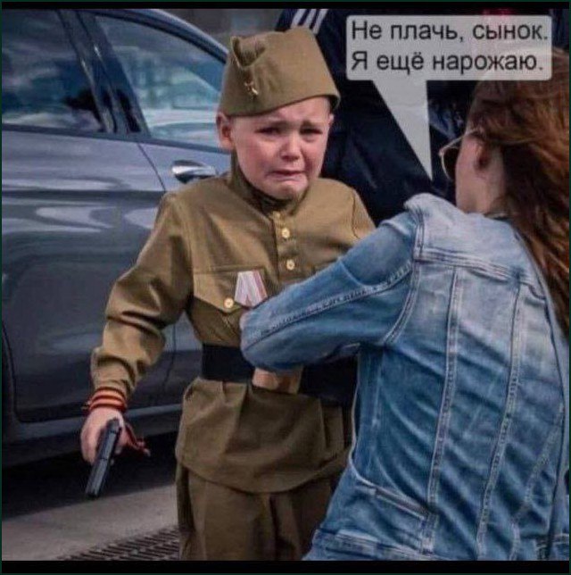 На изображении показан маленький мальчик, одетый в военную форму времен Второй мировой войны, который горько плачет. В правой руке он держит пистолет. Рядом с ним стоит женщина в джинсовой куртке, которая обнимает его, пытаясь утешить. Над головой женщины расположена реплика в текстовом облаке: «Не плачь, сынок. Я ещё нарожаю» (Don't cry, son. I'll give birth to more). Эта фраза добавляет иронический и циничный оттенок к ситуации, подчеркивая абсурдность происходящего.