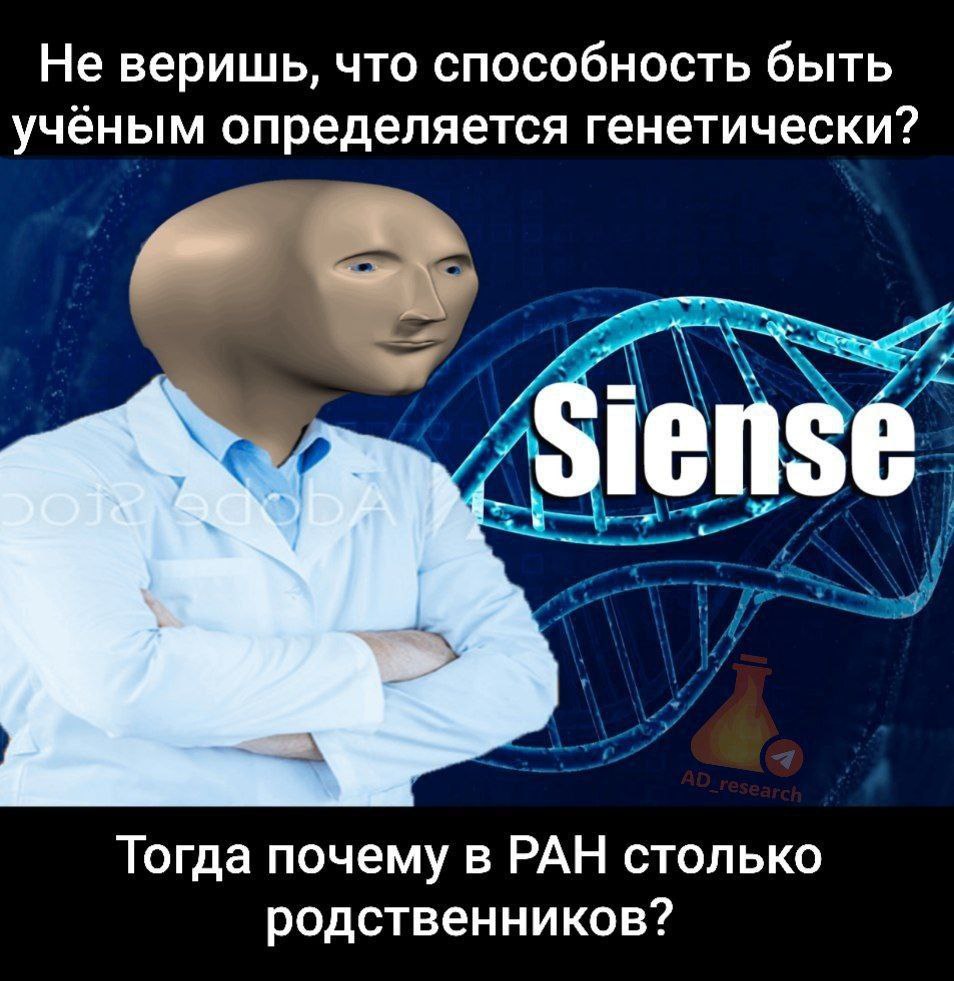 На мемной картинке изображен персонаж Мемный Человек (Stonks Guy) в белом лабораторном халате, стоящий со скрещенными руками. Его голова непропорционально большая и гладкая, а лицо выражает серьезное или задумчивое выражение. На заднем плане видна стилизованная двойная спираль ДНК, а поверх нее крупными буквами написано слово «Siense», с намеренной ошибкой в слове «Science». Также на заднем плане виден логотип телеграм-канала AD_research. Мем высмеивает идею о том, что научные способности могут быть генетически обусловлены, указывая на возможное кумовство в Российской академии наук (РАН) как на доказательство этой «теории».