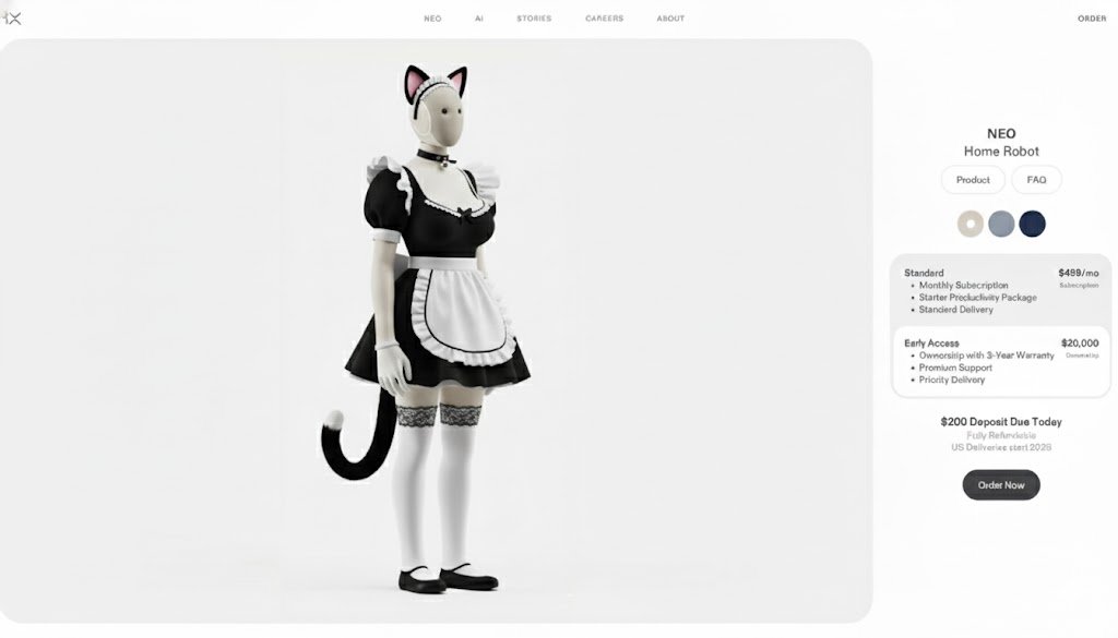 На изображении показан скриншот с веб-страницы футуристичного робота-горничной NEO Home Robot в образе кошкодевочки в черном платье с белым фартуком, чулками с подвязками и кошачьими ушками. Справа на странице указана цена за ранний доступ — 20 000 долларов, а также стандартная подписка за 499 долларов в месяц. Эта картинка вызвала обсуждения в интернете из-за необычного сочетания футуристического робота и традиционного костюма горничной, а также высокой цены за такое устройство. Это вызвало много шуток, где пользователи представляли, зачем кому-то мог бы понадобиться робот-горничная за столь высокую цену.