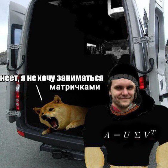 На меме изображен человек с накачанным телом, с прифотошопленным лицом улыбающегося мужчины, возможно, известного актера или музыканта, в черной шапке. На его футболке белыми буквами написана математическая формула. За его спиной открыт багажник минивэна, в котором лежит маленькая собака породы сиба-ину с широко открытой пастью, как будто она кричит или зевает. Рядом с собакой надпись: «Нет, я не хочу заниматься матричками». Фраза «Нет, я не хочу заниматься матричками» в сочетании с кричащей собакой и улыбающимся человеком, который, предположительно, является студентом или преподавателем, означает нежелание заниматься сложными математическими вычислениями, связанными с матрицами. Возможно, это отсылка к тяжелым сессиям или скучным лекциям, вызывающим отторжение у студентов. Это может быть ситуация, когда преподаватель или более опытный товарищ предлагает решить задачу, а другой категорически отказывается.