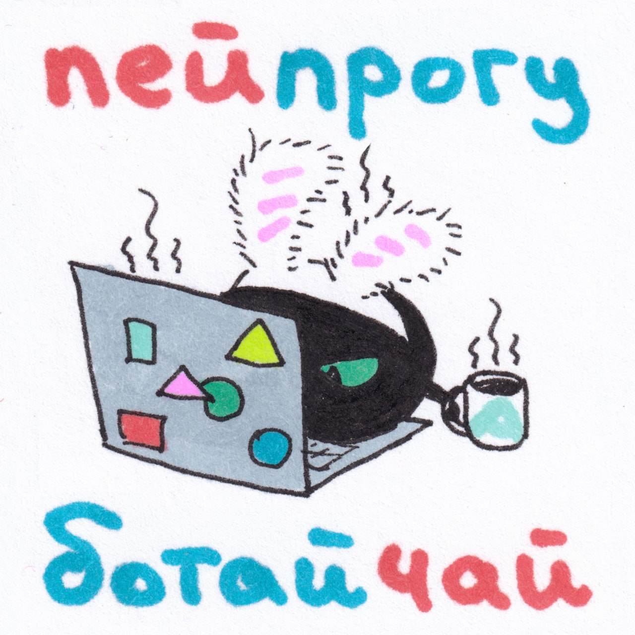 На изображении нарисован черный кот, который сидит за ноутбуком, а рядом с ним стоит кружка с чаем. Кот сосредоточенно смотрит в экран, его глаза зеленые, а из-за него виднеются пушистые розово-белые ушки. Слева от ноутбука и над кружкой идет пар, что говорит о горячем напитке и, возможно, напряженной работе. На экране ноутбука видны разноцветные геометрические фигуры: зеленый круг, розовый треугольник, синий круг, красный квадрат и зеленый треугольник, а также оранжевый квадрат. Над котом красными и синими буквами написано «нейропрогу», а под ним — «ботай чай». Это похоже на призыв к программированию и одновременному питью чая для сосредоточенной работы.