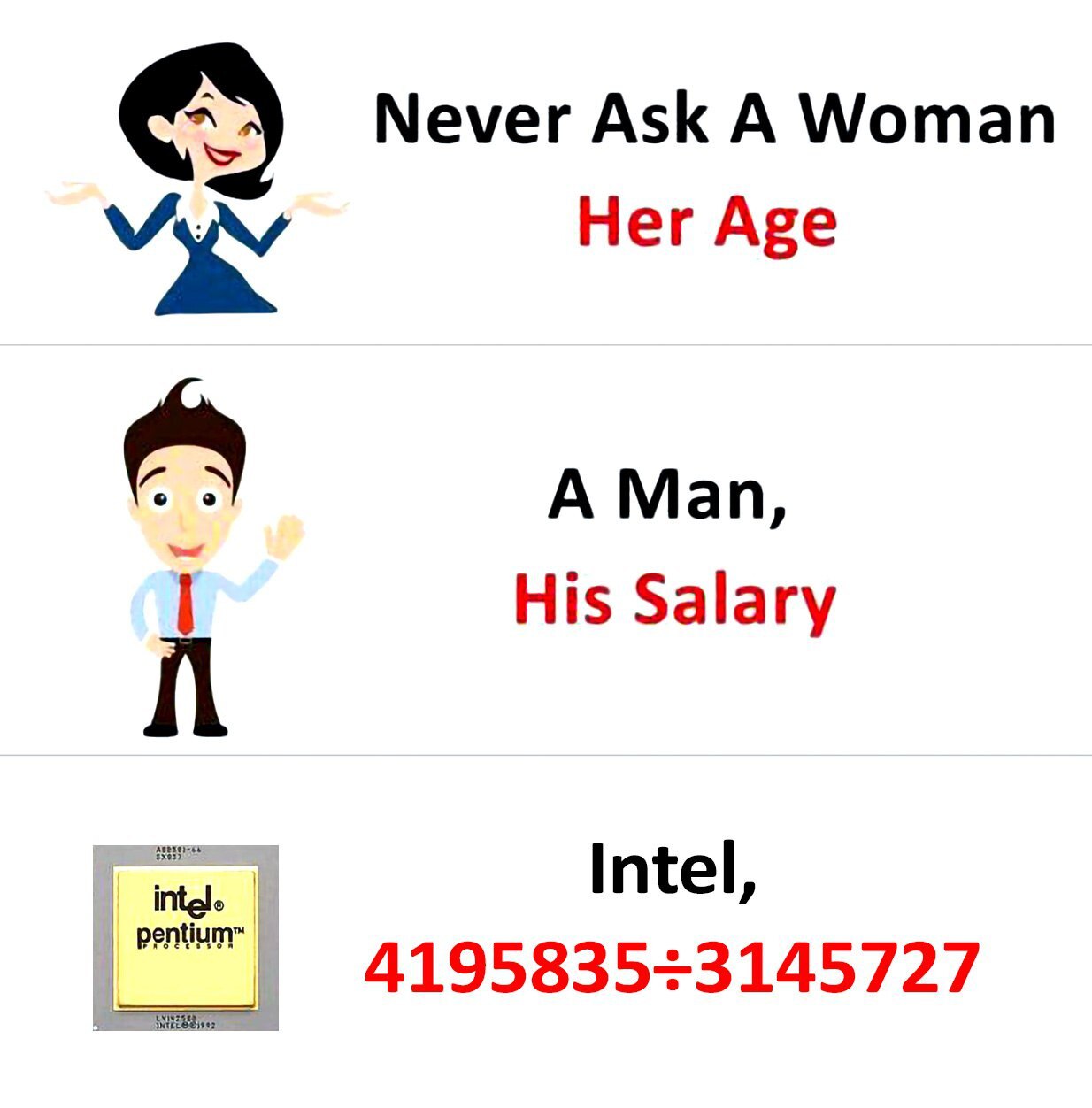 Мем разделён на три горизонтальные секции, каждая из которых содержит иллюстрацию и сопровождающий текст. В верхней секции изображена женщина в синем платье, которая разводит руками. Рядом с ней текст: "Never Ask A Woman Her Age" (Никогда не спрашивайте женщину о её возрасте). В средней секции нарисован мужчина в рубашке с красным галстуком, машущий рукой. Текст рядом с ним гласит: "A Man, His Salary" (Мужчину — о его зарплате). В нижней секции изображен процессор Intel Pentium, а рядом с ним текст: "Intel, 41958353145727" (Intel — о делении 4195835 на 3145727). Этот мем отсылает к знаменитому "багу деления" в процессорах Pentium, который привёл к неточностям в вычислениях.